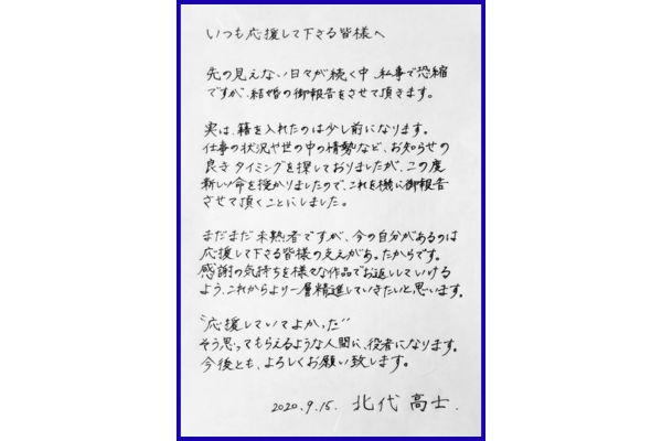 北代高士さんは、2020年9月15日に結婚したことを報告しています。