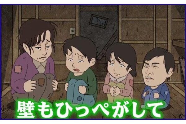 しかし、テレ東で2024年2月の放送されていた「じっくり聞いタロス〜スター近況㊙︎報告」の話の中で出てきた状況を再現したアニメ画像では、取り壊し中の家に身を潜める母親と3兄弟が描かれていました。