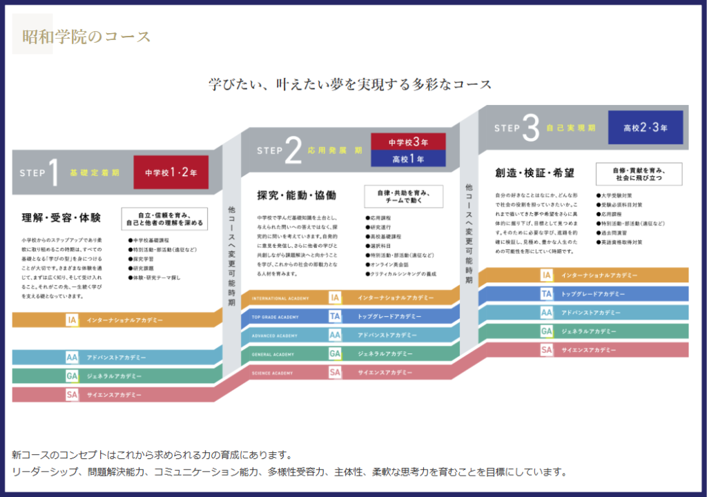 昭和学院中学校は「中堅校」という位置づけながら、多彩なコース制と国際教育、活発な部活動が盛んな学校です。