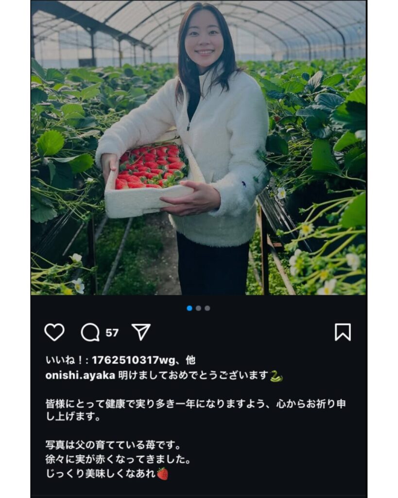 大西礼芳さんのインスタグラムでは、父親が育てた苺を紹介している投稿がありました。